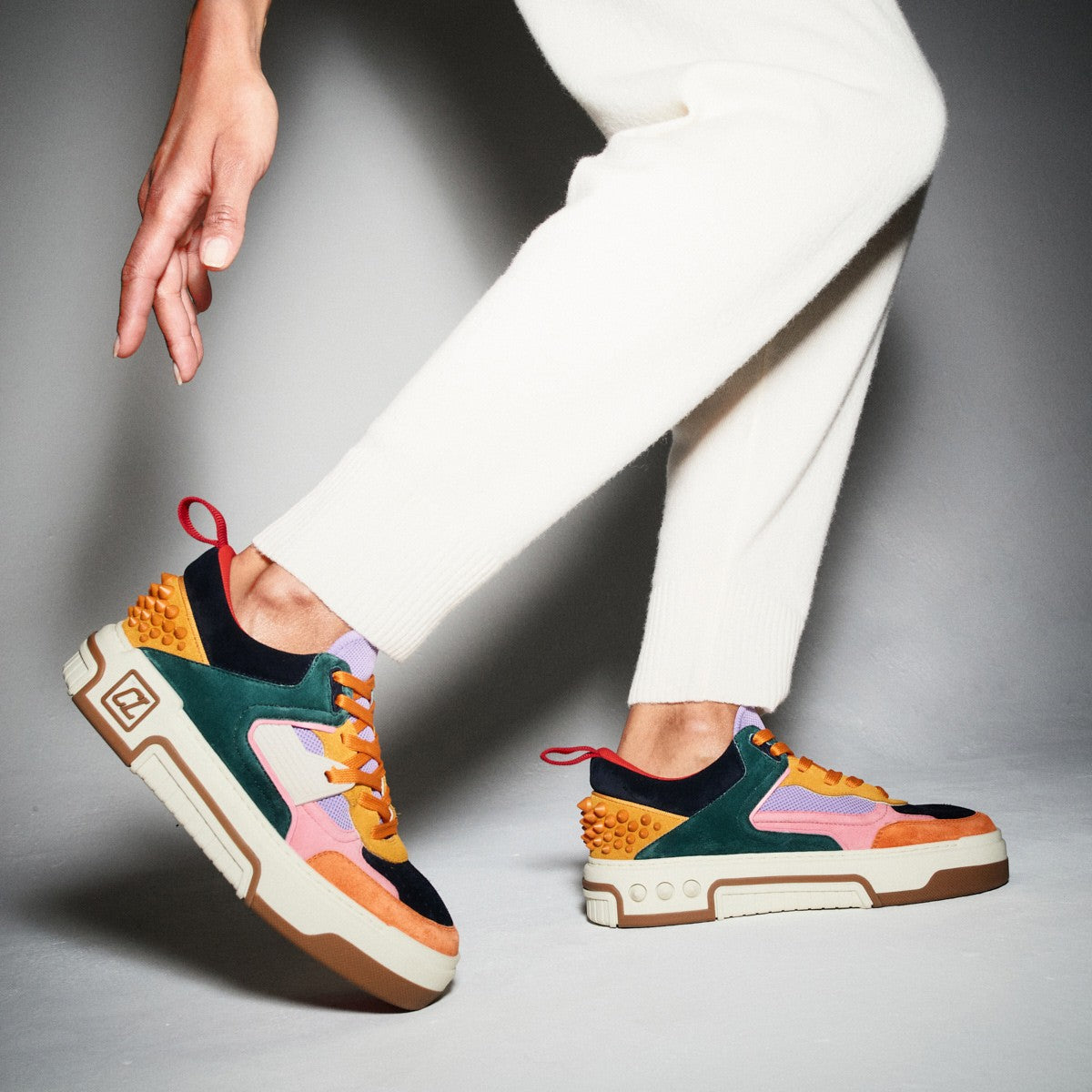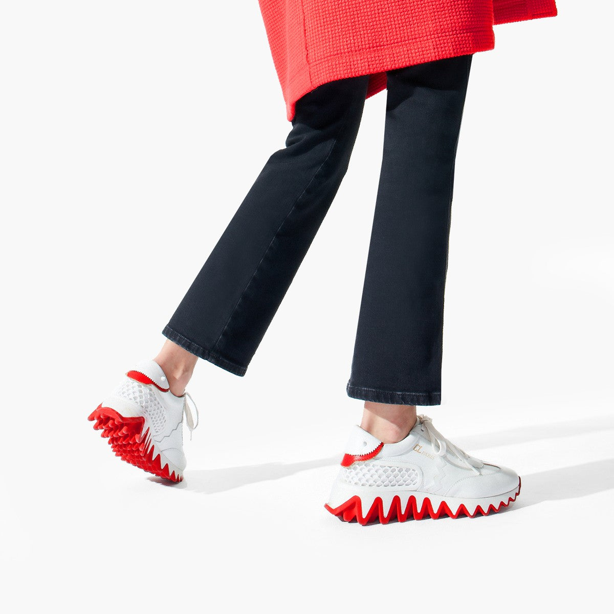 クリスチャン ルブタンのアイコニックなLoubisharkを再解釈し、メゾンならではの異素材使いで仕上げたスニーカー、Mini Shark。サメの歯を彷彿とさせるツートンカラーのラバーソールに、ホワイトのカーフレザー、ホワイトのラバーを合わせました。背面を彩るホワイトのシグネチャースパイクも魅力です。