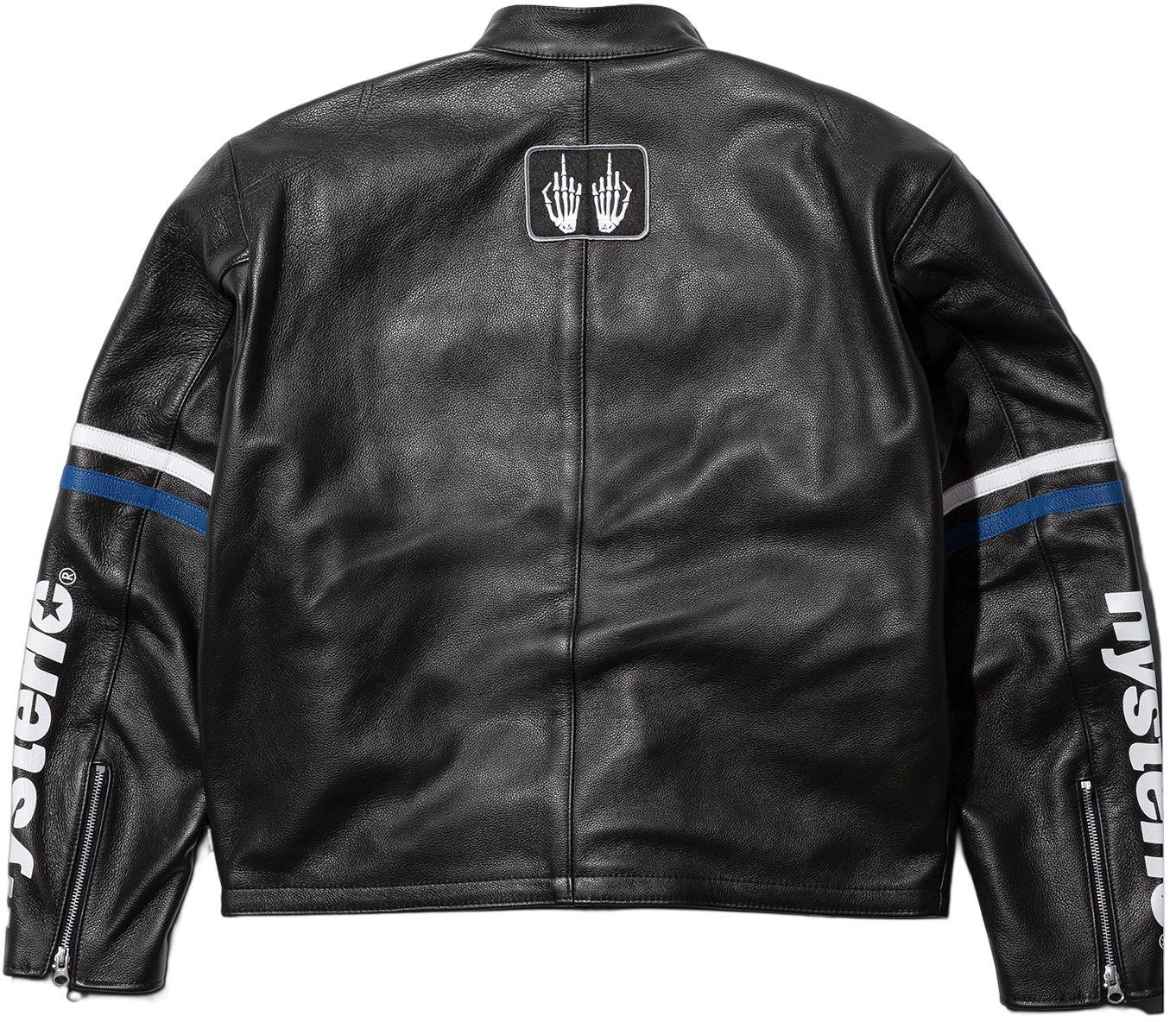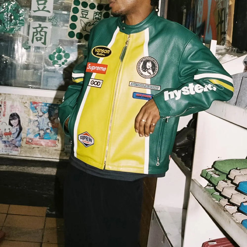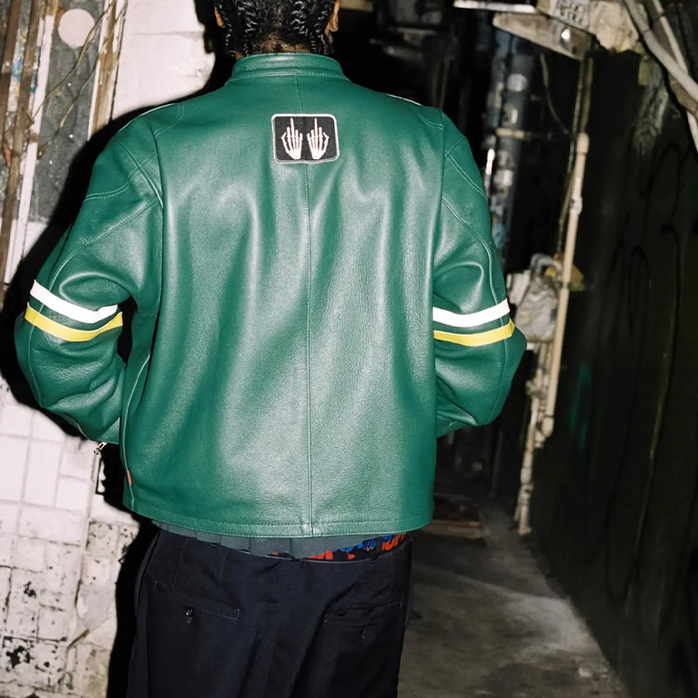 カスタムフィットのコンペティションウェイトカウハイドレザーにビスコースの裏地を施しました。フルジップ開閉で、フロント下部にダブルウェルトジップハンドポケット、内側に胸ポケットを備えています。袖口はジップ開閉、襟はスナップボタン留めです。胸と背中には刺繍パッチ、袖にはプリントグラフィックが施されています。Supreme限定生産。
