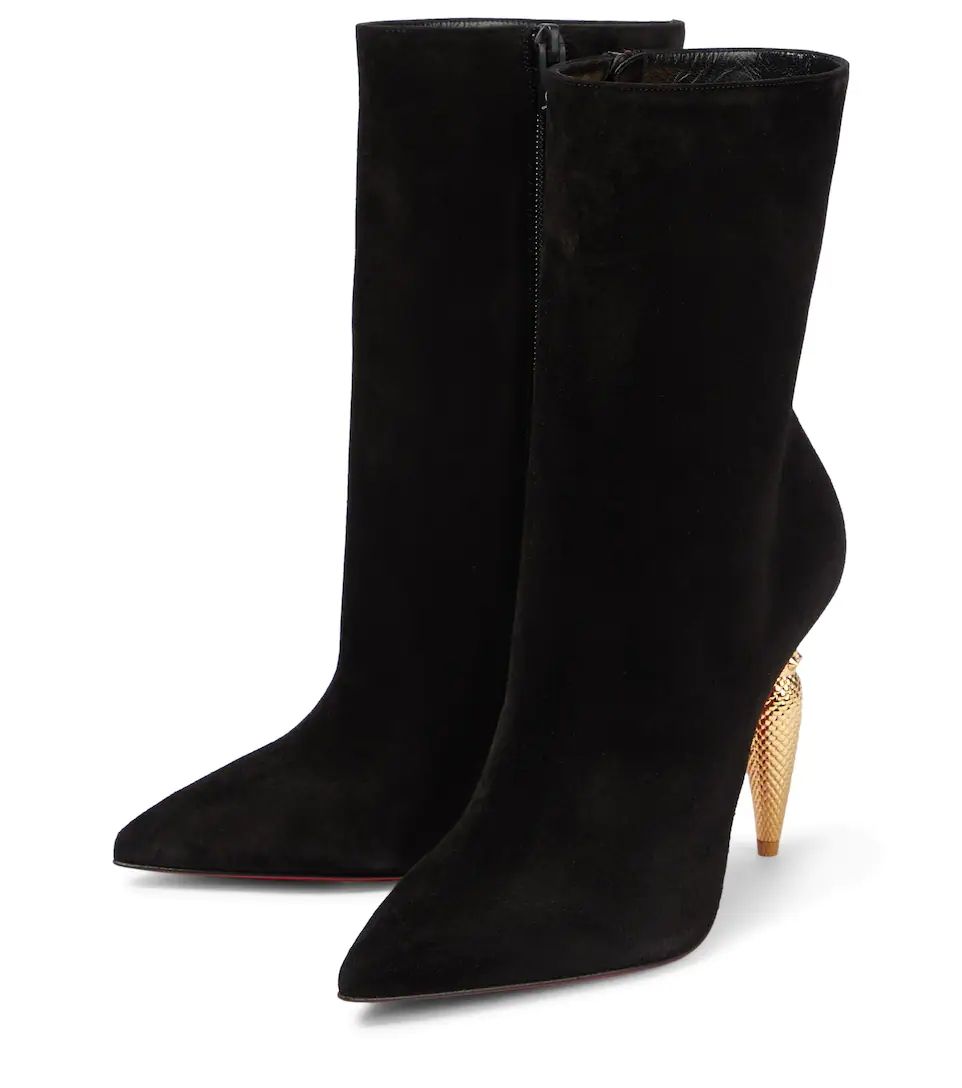 Featuring unique curved metal heels that mirror the label's signature lipstick bottle, the Lipbooty ankle boots from Christian Louboutin are made from suede and have pointed toes.