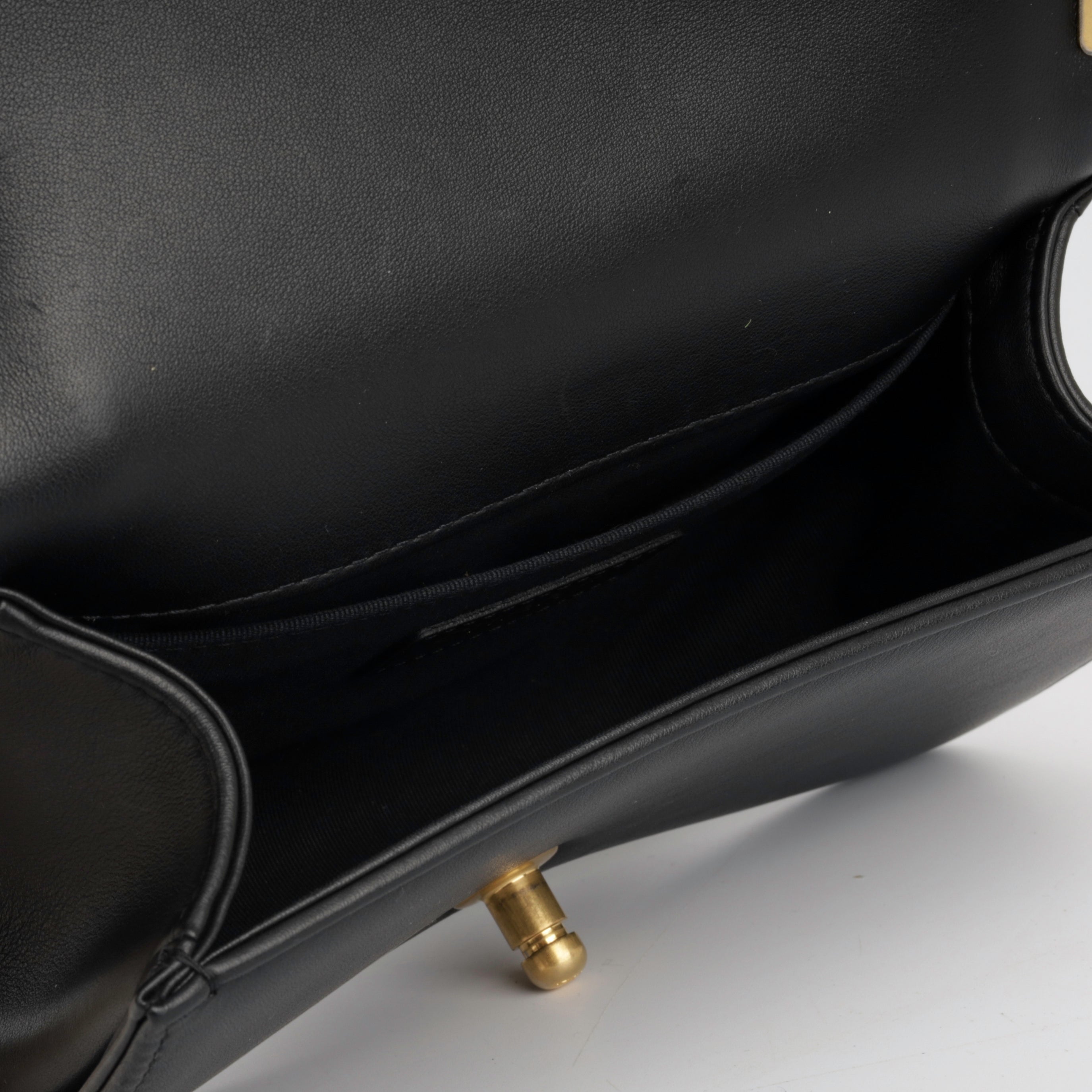 The 'Boy' bag. first introduced in 2011 and named after Coco Chanel's lifetime love. is part of their iconic collection. This particular edition is created usingblack lambskin leather and can be worn with the chaindoubled up over the shoulder for an evening look or wear cross body for a more casual style.