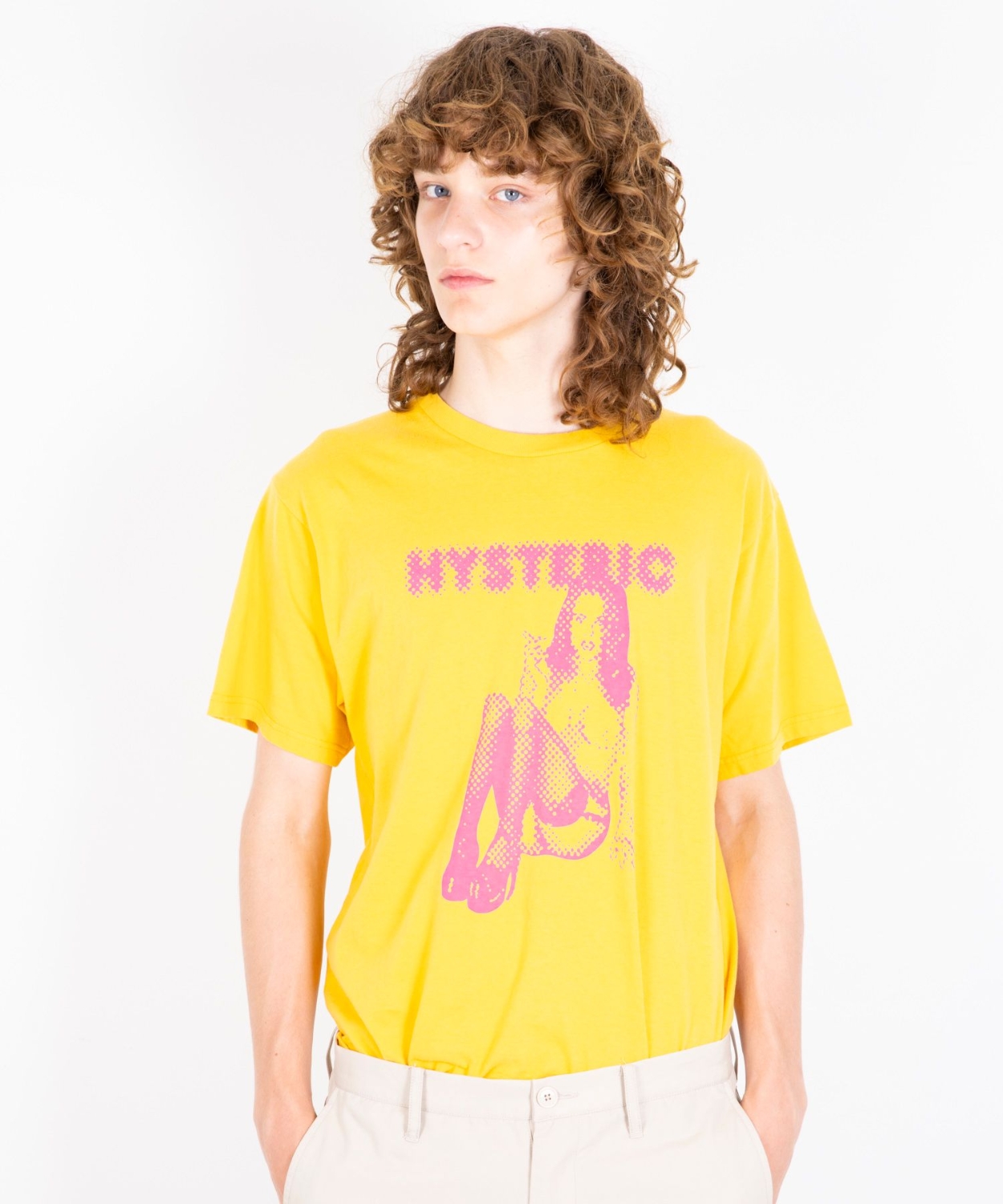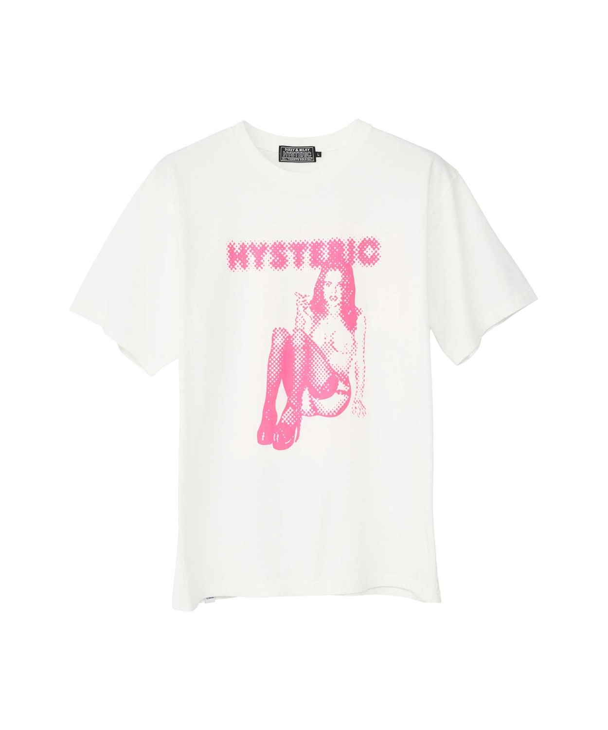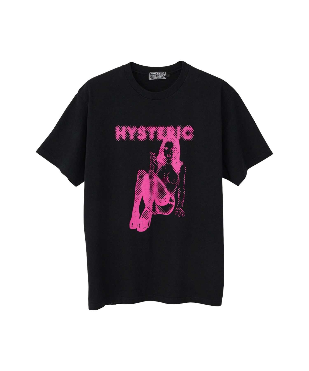 裏路地に貼ってあるナイトクラブのチラシを感じさせるチープで妖艶なHYSTERIC GLAMOUR初期のグラフィックをブラッシュアップして仕上げた一枚。肉厚でハリのあるカジュアルな素材を使用。